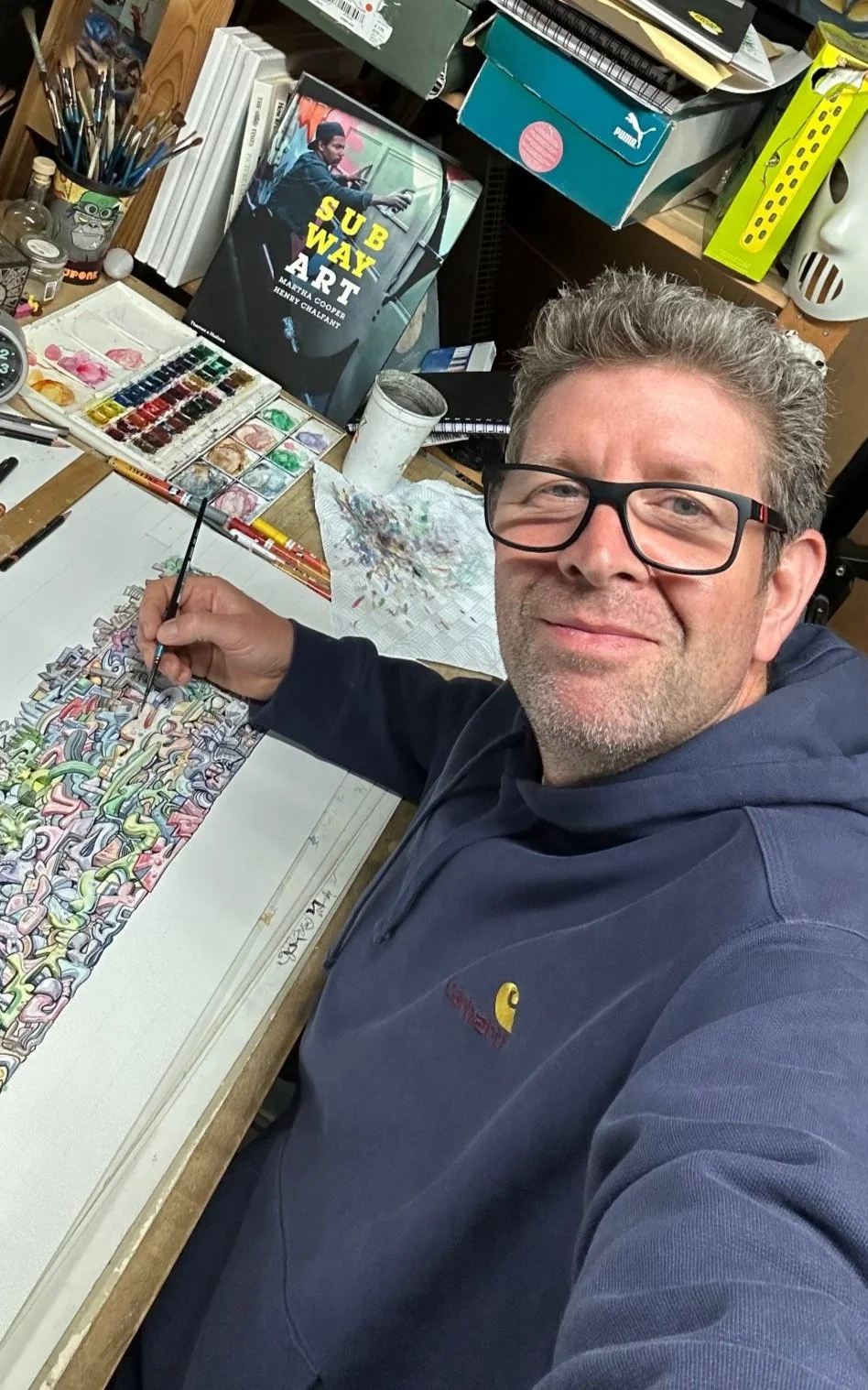 Inspired by the New York graffiti scene in the early 1980s which shaped much of my youth, and my classical study of the portraiture and landscapes of the old masters, I am now working with watercolour and ink and in the space between many disciplines. The core of my work is delving into and spending time in the details and giving the work its own rhythm.